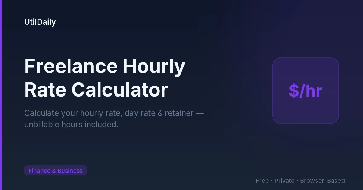 A freelance pricing calculator is a tool that computes the minimum hourly rate you need to charge to meet your financial goals as an independent contractor. Unlike a simple income-divided-by-hours calculation, a good freelance pricing calculator accounts for business expenses (software, equipment, health insurance), vacation time, and crucially, the percentage of hours that are not billable (spent on admin, sales, and overhead). This calculator outputs four rate formats — hourly, daily, weekly retainer, and monthly retainer — so you can respond to any client pricing request with a number you know covers your real cost of doing business.