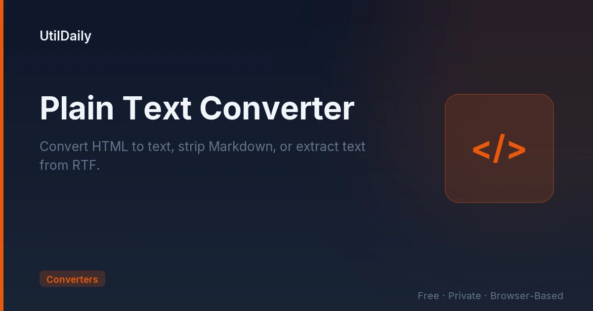 Plain text extraction is a common workflow in content migration, data cleaning, and text analysis. Web developers strip HTML from CMS exports when migrating between platforms, data engineers extract text from email HTML for NLP pipelines and sentiment analysis, and content teams convert Markdown documentation into plain text for compatibility with legacy systems or plain-text email newsletters. The output from this converter pairs well with the Text Analyzer on this site for word count and readability scoring, or with the Text Cleaner to normalize whitespace and remove special characters from the extracted text.