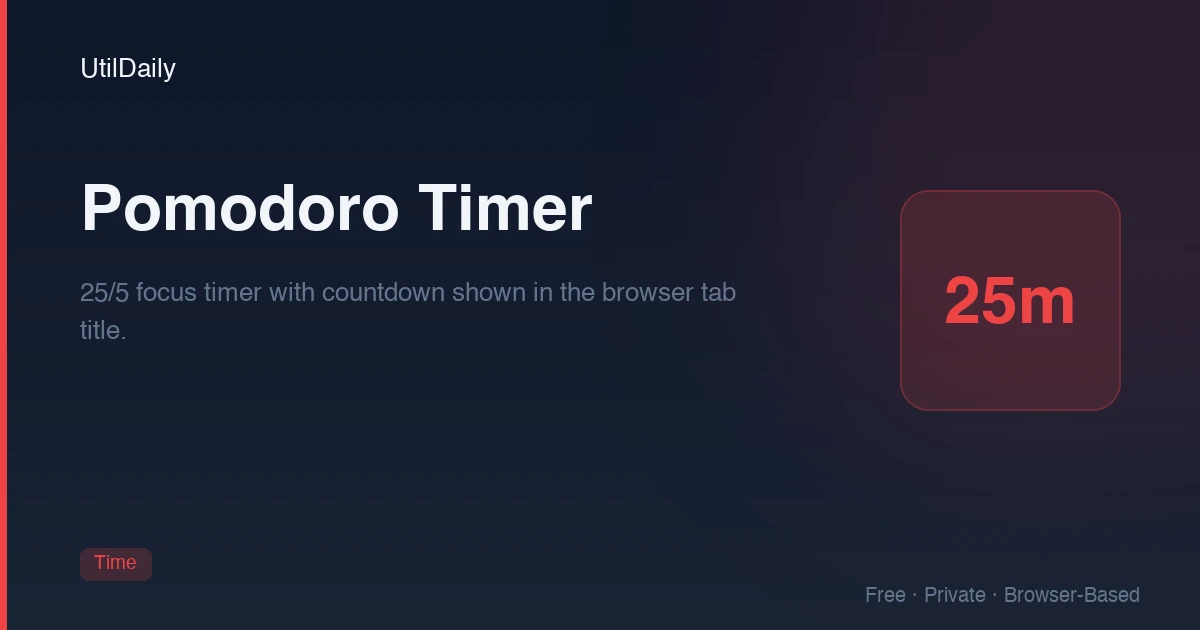 The Pomodoro timer runs entirely in your browser using client-side JavaScript. No data is sent to any server — no session counts, no timer settings, no usage analytics. The timer uses the browser's built-in setInterval and setTimeout APIs for countdown timing, and the Web Audio API or HTML5 Audio for alert sounds. When you close the tab, all state is cleared. Your focus sessions are completely private.