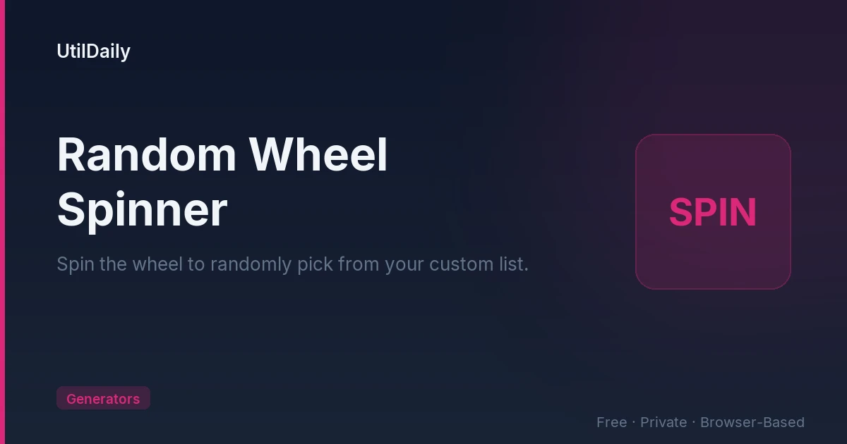 The Random Wheel Spinner is a free, browser-based tool that uses cryptographic randomness (Web Crypto API) to fairly select winners from your custom list. Import up to 500 items via CSV, choose from 3 spin modes (Normal, Eliminate, Accumulate), and export full history for transparency. No sign-up required, no server transmission — 100% private and works entirely in your browser.